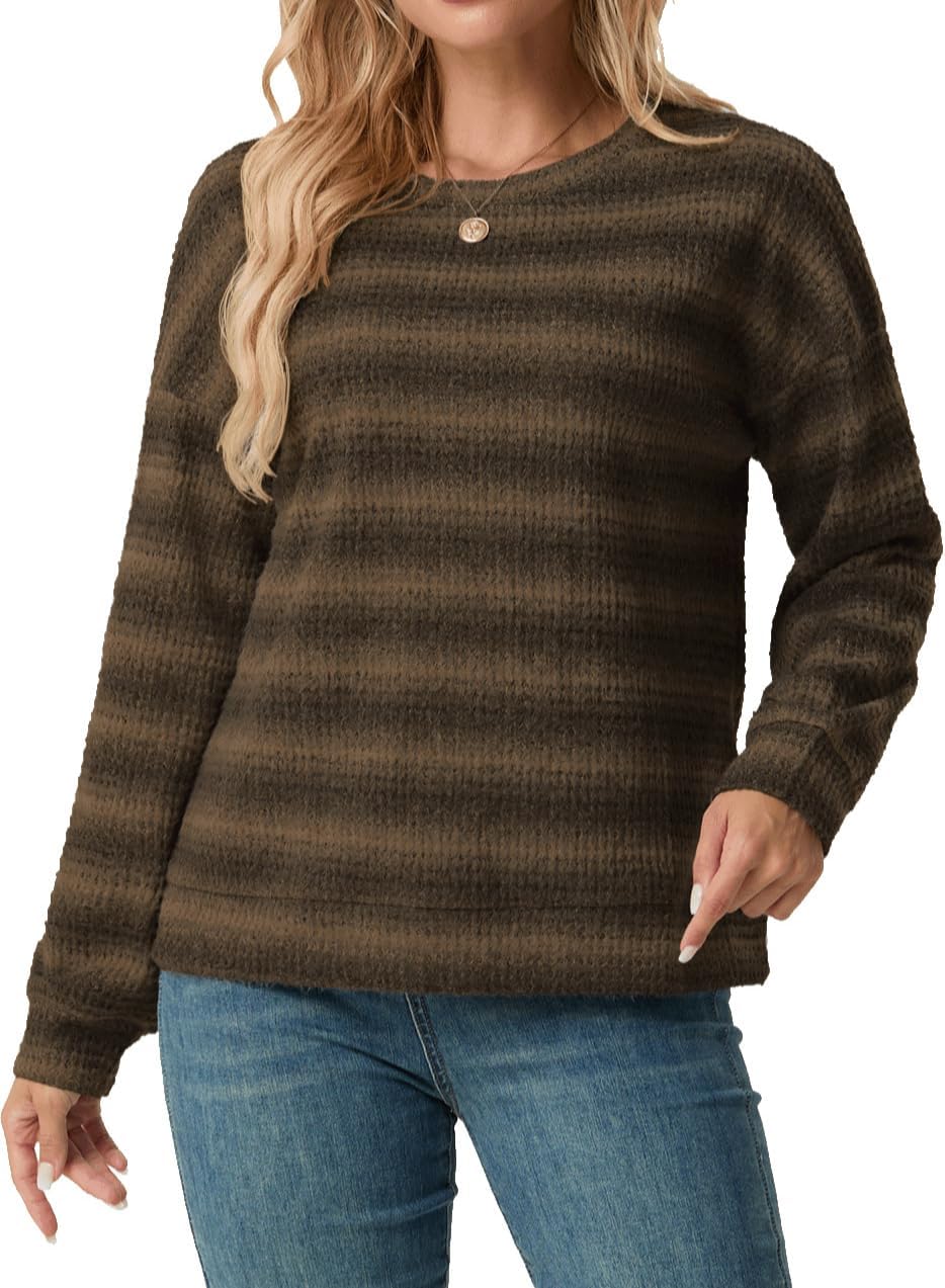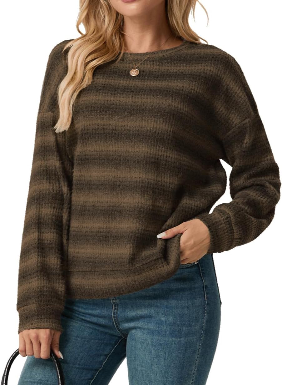 IWOLLENCE Women’s Lightweight Waffle Knit Striped Long Sleeve Tops Crewneck Preppy Shirts Casual Loose Fall Sweaters